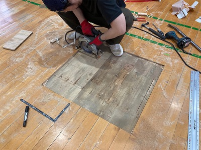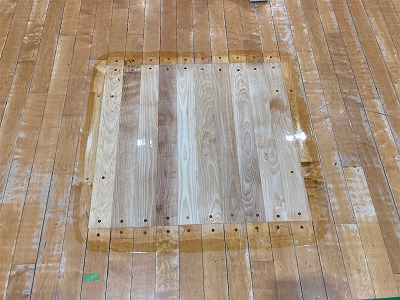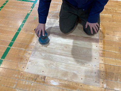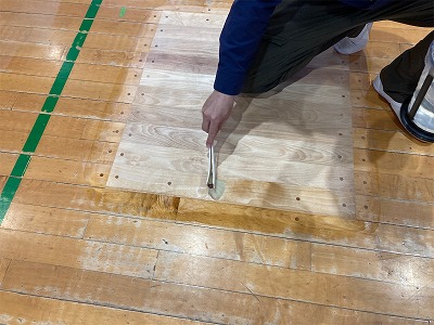 UVパテは、紫外線を照射すると強固に木材に密着して硬化するので、補修後体育館をすぐに使うことができます。
